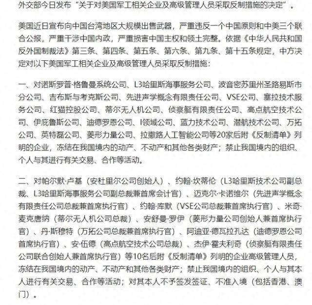 12月26日,北京时间,外交部发布了对美新一轮制裁决定。20家美国军工企业被正式列入“反制清单”,理由直指美方近期宣布对**地区出售武器,这一举动违反了中美三个联合公报及此前承诺。伴随制裁一同公布的还有详细措施,包括冻结这些企业和负责人在华境内资产,并禁止中国个人及机构与上述对象开展合作或交易。甚至,受制裁高管也不得入境中国大陆、香港和澳门。