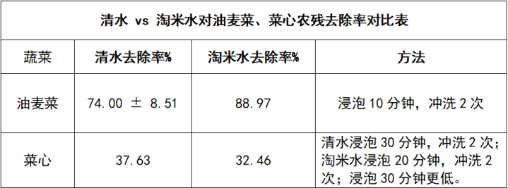 为了对比不同清洗方式对蔬菜农药残留去除效果的作用,2020年发表在《现代食品科学》上的一项研究曾对湛江市售的油麦菜和菜心进行了农药残留检测,并比较了清水、淘米水等方式的去农残效果。结果显示清水浸泡冲洗和淘米水浸泡冲洗对蔬菜农药残留去除率差异并不显著。