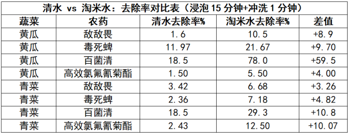 2016年发表在《河南农业》上的一项研究,比较了黄瓜和青菜分别在清水、淘米水等多种清洗方式的作用下,对敌敌畏、毒死蜱、百菌清、高效氯氟氰菊的去除效果(均为浸泡15分钟,冲洗1分钟)。结果显示,淘米水对它们的清除效果均优于清水。